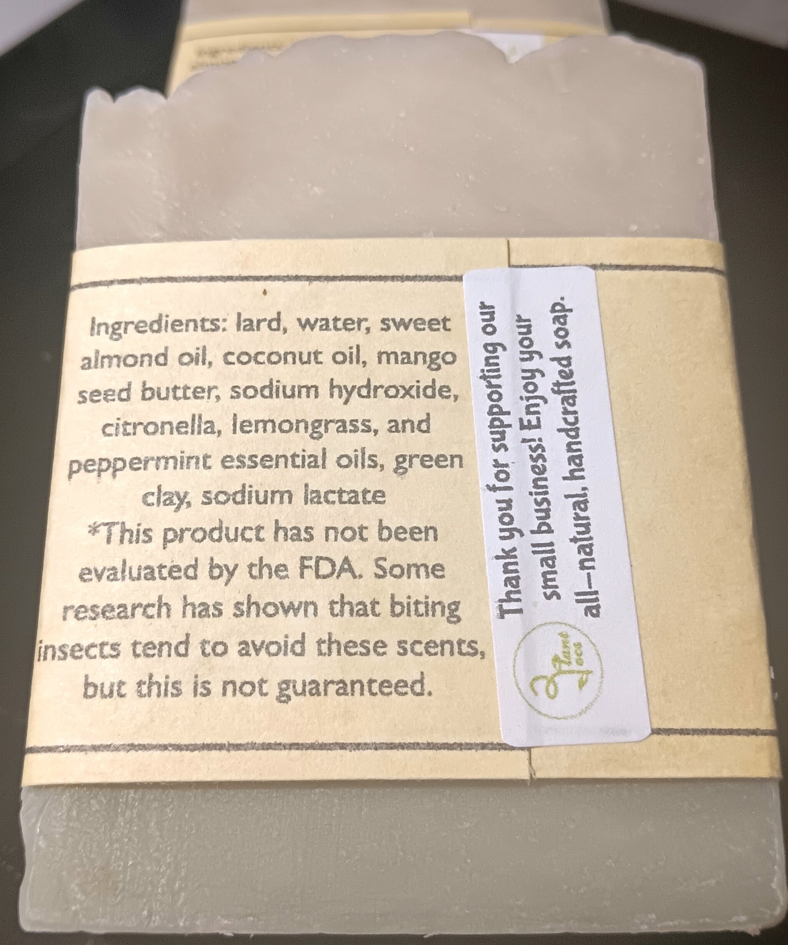 lard, water, sweet almond oil, coconut oil, mango seed butter, sodium hydroxide, citronella, lemongrass, and peppermint essential oils, green clay, and sodium lactate